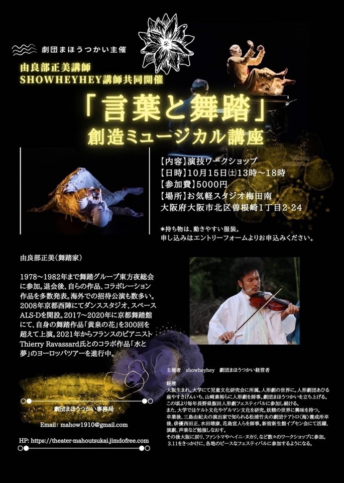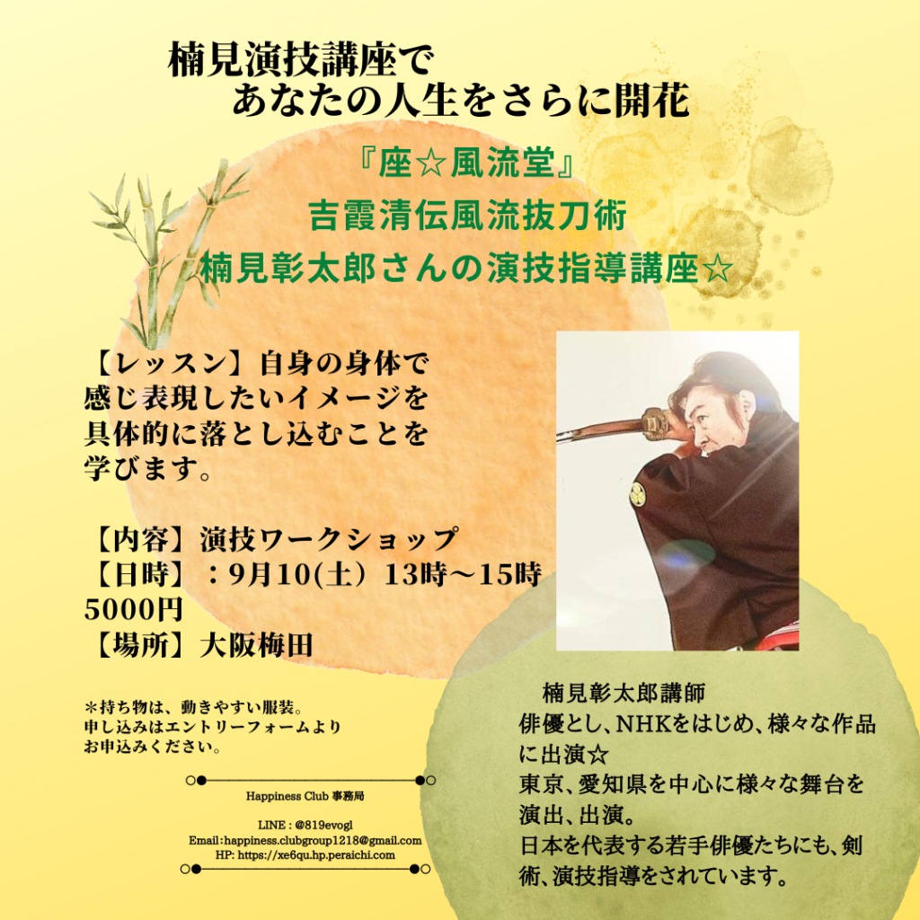 楠見演技講座であなたの人生をさらに開花させるための情報が記載されています。『座☆風流堂』吉襲清伝風流抜刀術の楠見彰太郎さんが演技指導を行う講座です。